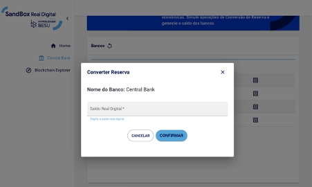 Através desta funcionalidade, será possível adicionar Real Digital à carteira do banco, simulando a conversão de moeda fiduciária em Real Digital (CBDC).