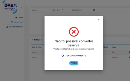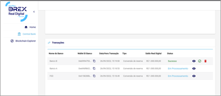 Cada transação na blockchain pode levar, em média, 12 segundos para ser processada. Por este motivo, em todas as telas, temos uma seção 'Transações'. Através desta seção, será possível monitorar uma transação específica com os seguintes status: