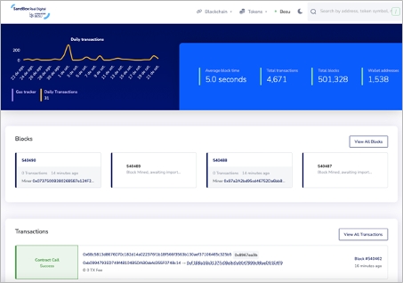 Em cada um dos ambientes, a opção 'Blockchain Explorer' está contida no menu principal. Essa opção proporciona acesso a uma poderosa ferramenta que permite ao usuário acompanhar e examinar, em tempo real, todas as transações em andamento na blockchain